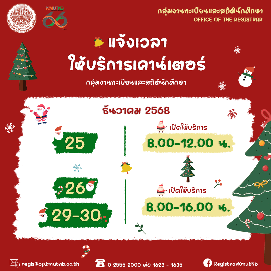 แจ้งเวลาให้บริการเคาน์เตอร์ วันที่ 25-26 และ วันที่ 29-30 ธันวาคม 2568 Posted on 24 ธันวาคม 202524 ธันวาคม 2025 in ข่าวประชาสัมพันธ์ Facebook iconFacebookTwitter iconTwitterLINE iconLine