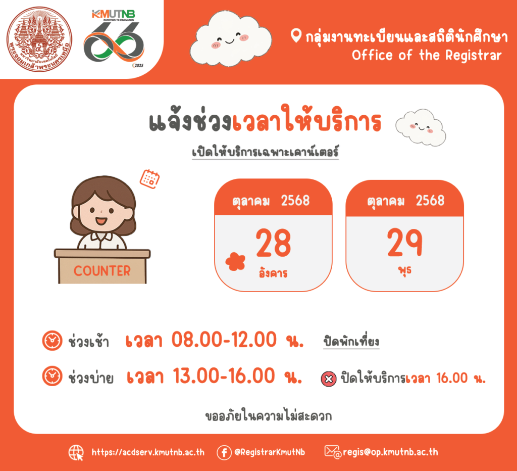 แจ้งวันเปิด-ปิดให้บริการของกองบริการการศึกษา วันที่ 19-21 และ 28 มิถุนายน 2568